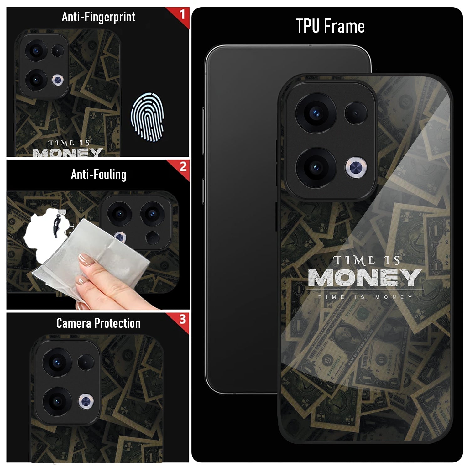 Oppo Reno 13 5G Premium Acrylic Shockproof Glass Back Case (Time is Money)