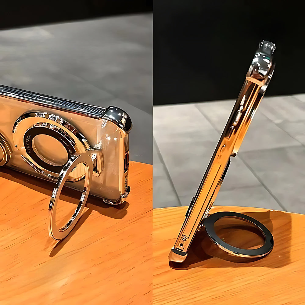 Sleek. Functional. Protective. This transparent case with a sturdy built-in non-rotating magnetic stand is perfect for hands-free viewing and magnetic mount support—without compromising on your phone’s style.